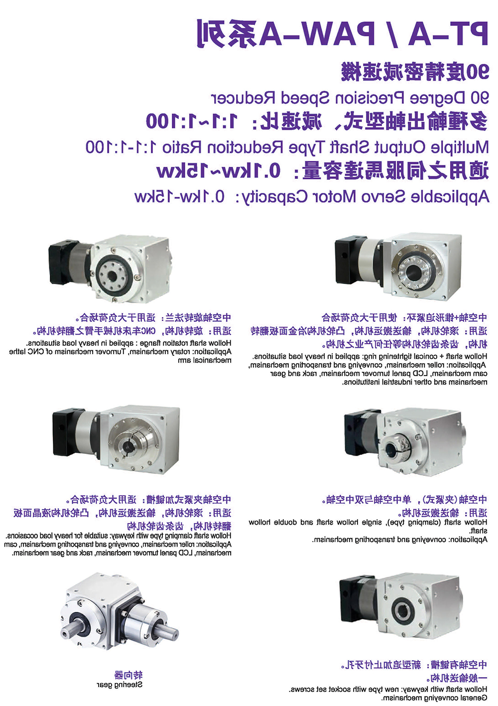 多样化:输出轴种类多样化,有单出力轴型、双出力轴型、中空轴型、中空法兰型、中空轴锥形紧迫性、螺杆直线型、螺牙直线型。